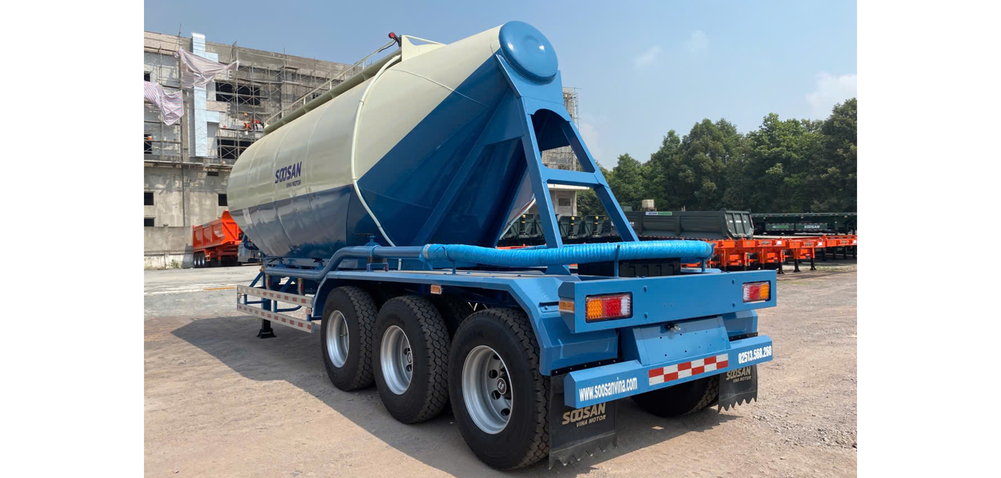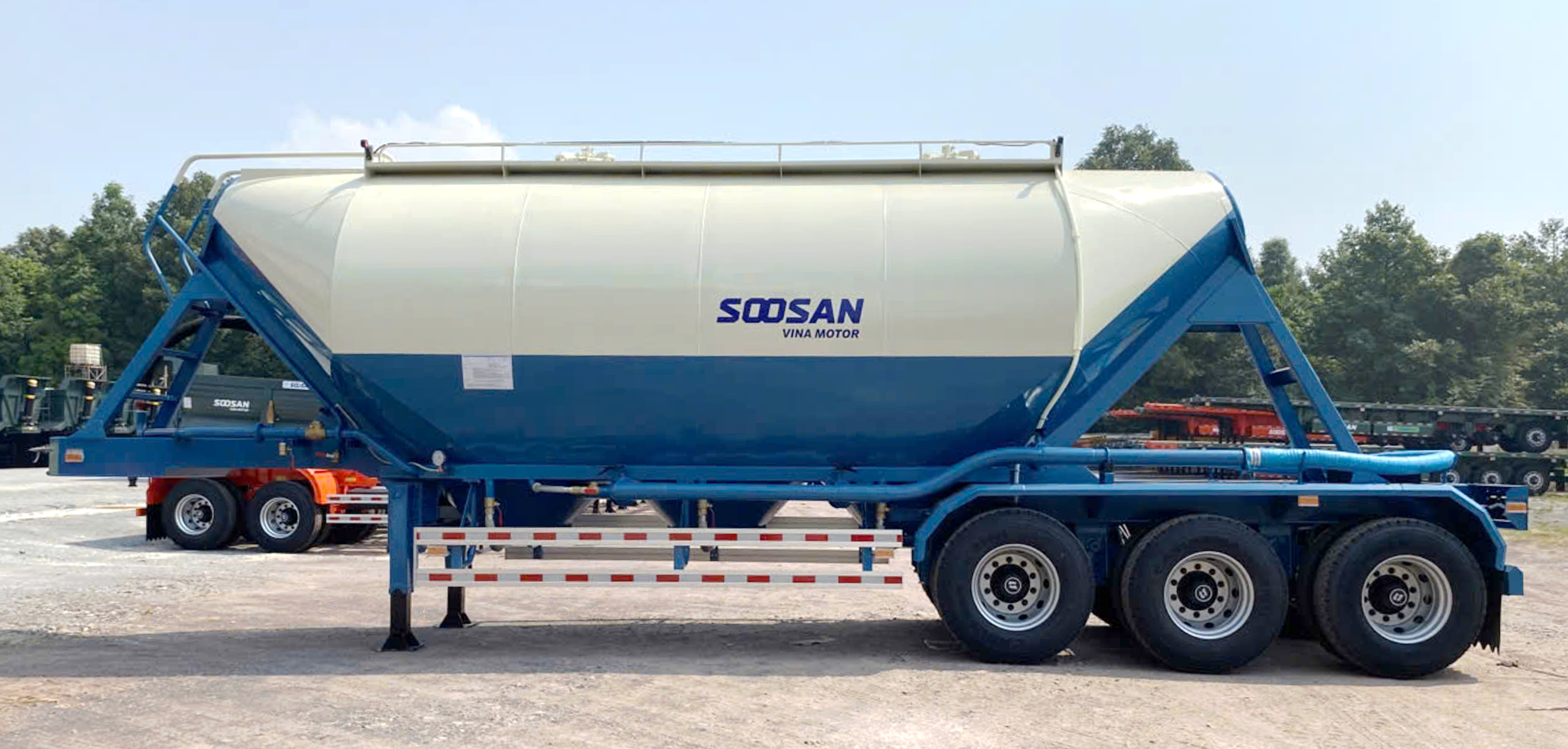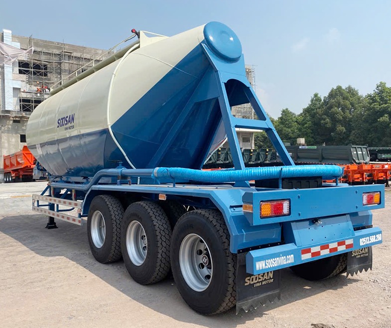 Bồn chứa có kích thước 8150/7510 x 2485/680 x 2960/2380 mm, được thiết kế tối ưu cho quá trình vận chuyển và xả xi măng rời hiệu quả. Sản phẩm được sản xuất theo tiêu chuẩn kỹ thuật Hàn Quốc, thể hiện chất lượng và độ tin cậy của Soosan Vina Motor (tiền thân Doosung).